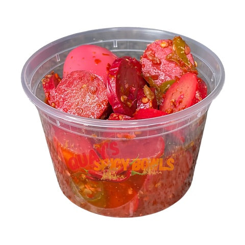 The Famous Spicy Bowl consist of cut up pickled hot sausages (pork) and 2 homemade pickled eggs. All bowls are seasoned to perfection and topped with diced jalapeƱo peppers. Each bowls comes with your choice of chips!